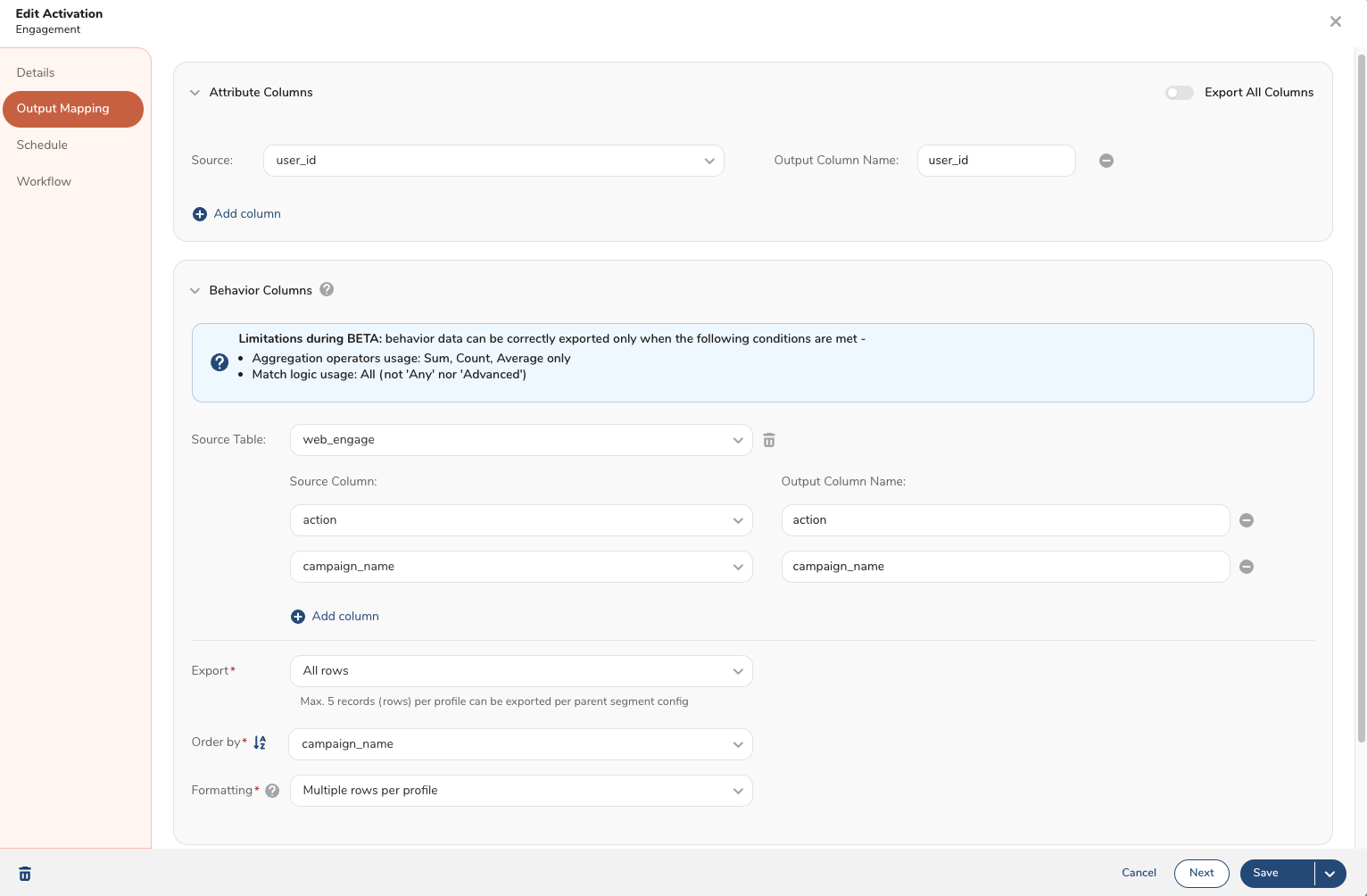What behavior data gets exported? Behavior filters from the segment rules will be applied to all qualifying profiles.