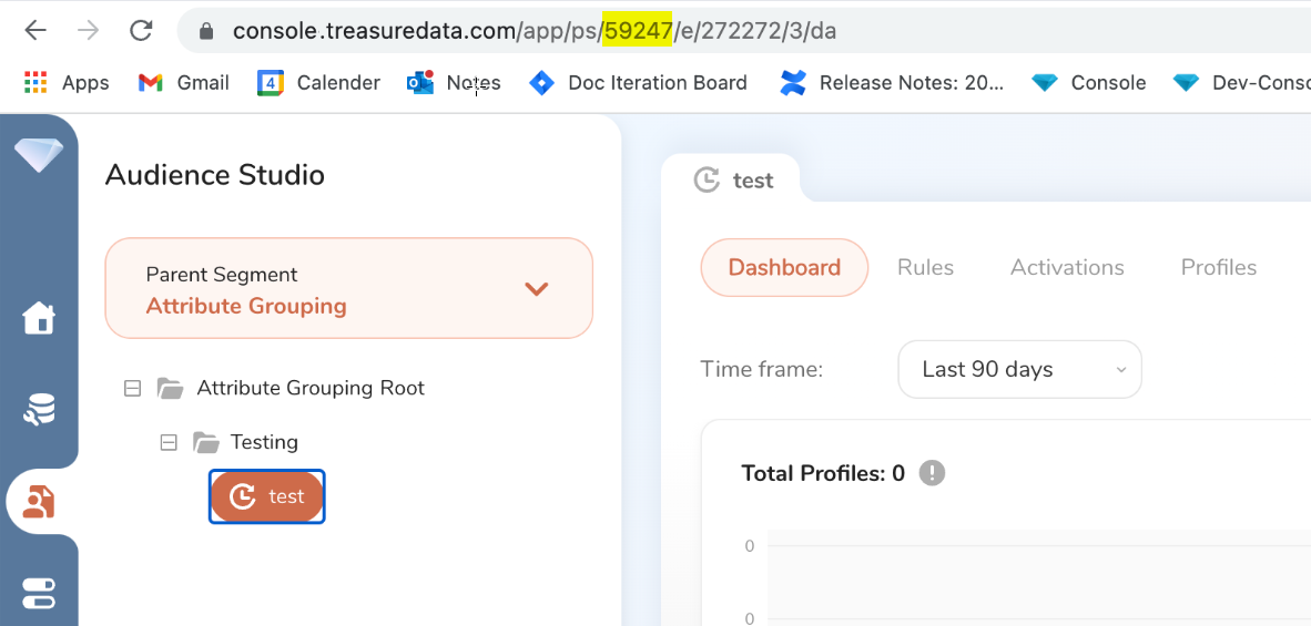 In the Treasure Data Console, navigate to Audience Studio and select the parent segment you want to work with. The segment ID can be found in the URL after the text /app/ps/.