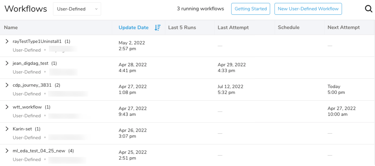 A Treasure Data workflow automates any kind of manual operations. For example, you can define a sequence of tasks as a workflow and Treasure Data continues to run the workflow until a schedule stops it. The Workflow Landing page helps you to quickly review relevant workflows in a single pane of glass.