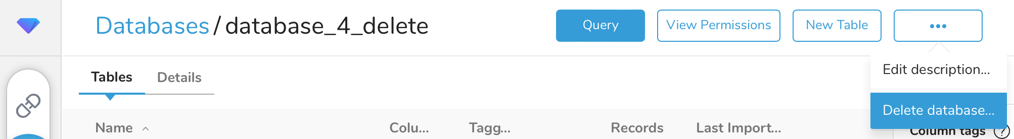 The deleting a TD database removes a database, its tables and all data stored within the database. This operation cannot be rolled back and the data will be unrecoverable by yourself.