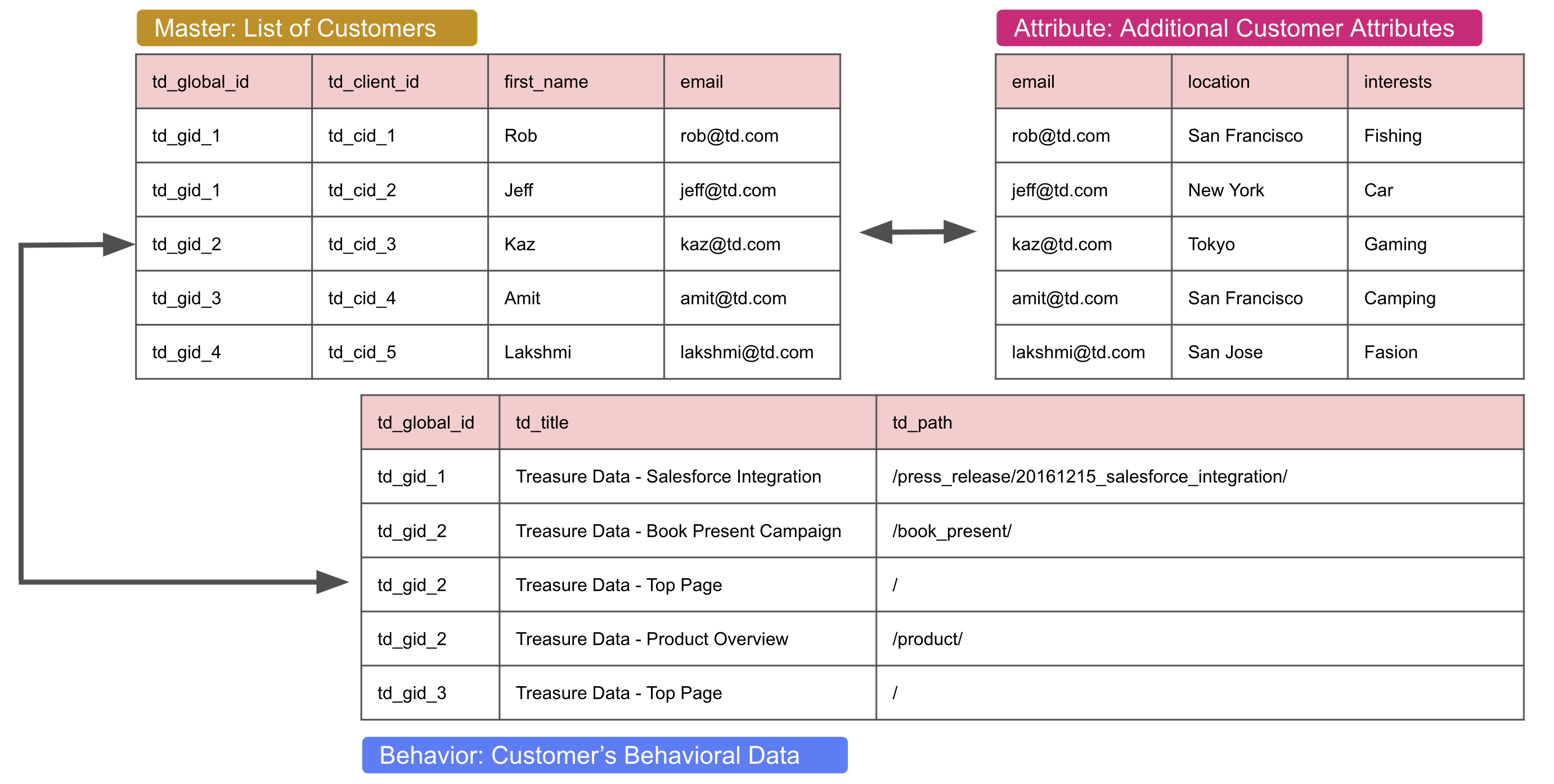 Attributes and behaviors are often linked by a common ID (typically the td_global_id or Customer ID).