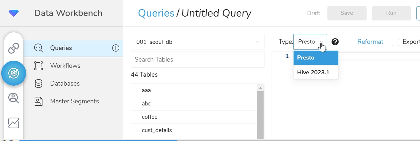 Click Type in the query editor and choose Hive 2023.1 from the drop down list.