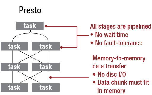 After a query is compiled, Trino(Presto) processes the request into multiple stages across the worker nodes. All processing is in-memory, and pipelined across the network between stages, to avoid any unnecessary I/O overhead.