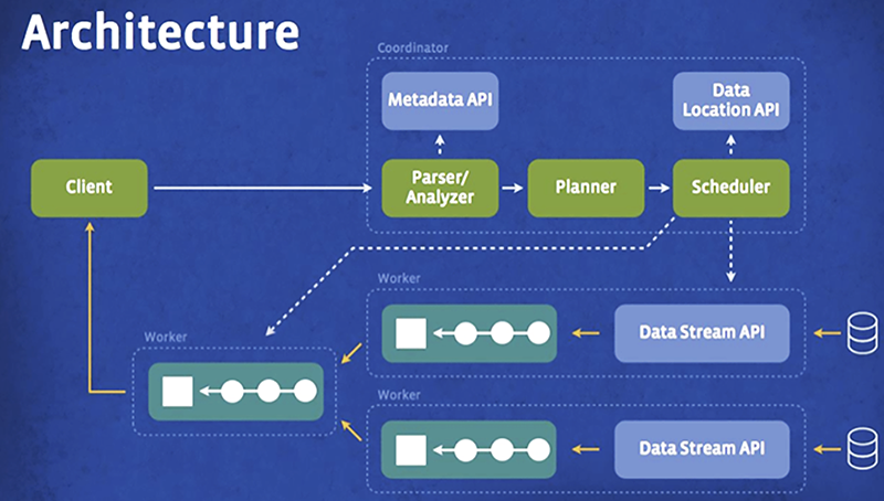 Trino(Presto) uses an architecture similar to a classic massively parallel processing (MPP) database management system.