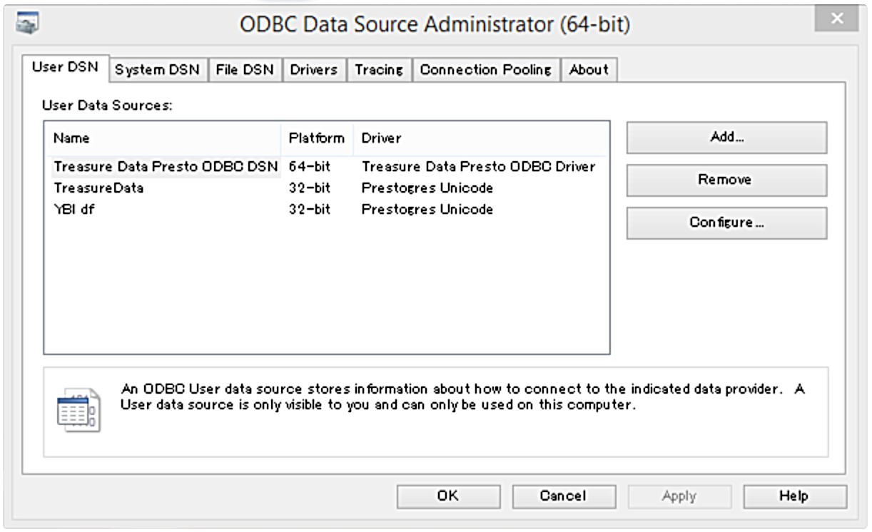 Treasure Data ODBC Driver for 32bit is no longer supported. Replace it with Presto ODBC Driver according to the following instructions. The old driver is no longer supported.