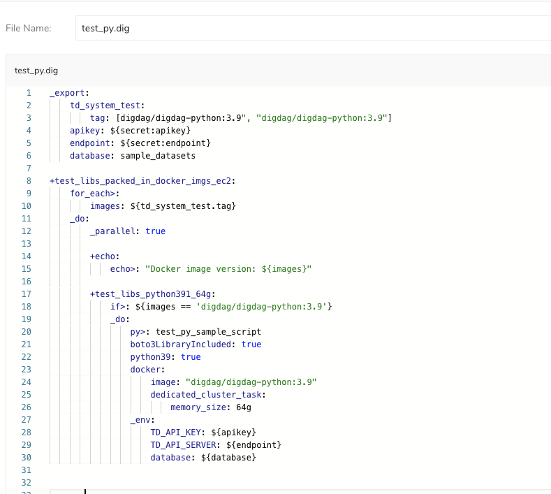 image: "digdag/digdag-python:3.9"The Python scripts in TD Workflows are managed and run by Treasure Data in isolated Docker containers. Treasure Data provides a number of base Docker images to run in the container. You can pick the appropriate Docker image to run your Python script in, based on the Python version and libraries supported by the image.