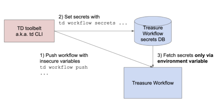Digdag has a feature to store secrets information. Secrets are stored on Digdag or a Treasure Data Workflow database when executing td workflow secrets subcommands.