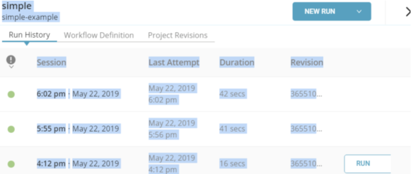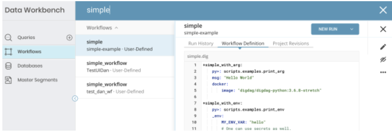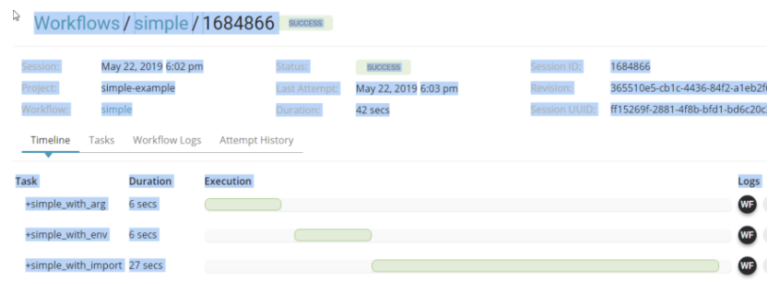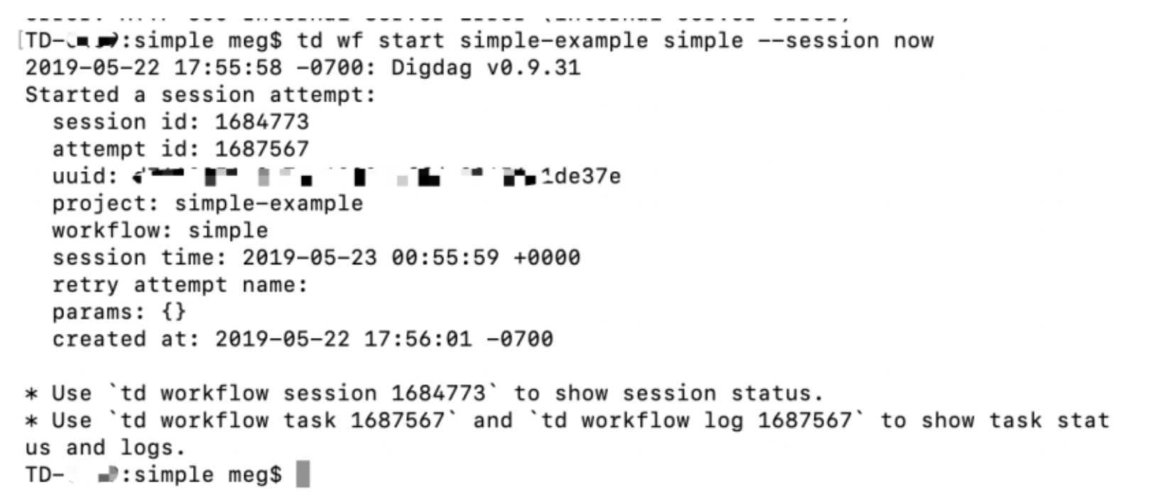 td wf push simple-exampleThis runs the simple.dig workflow and uploads the simple-example to TD.