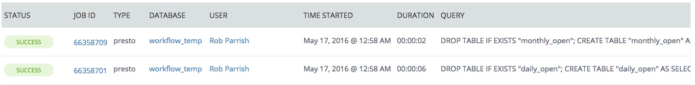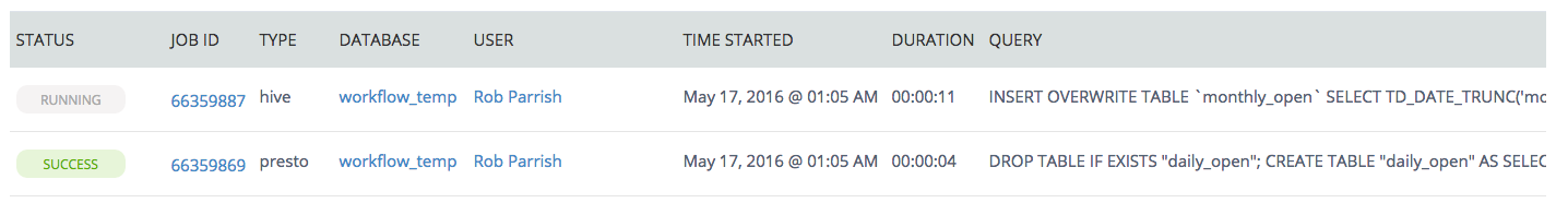 create_table: monthly_openGo to your Treasure Data jobs page, so you can follow along as you run the following workflows. You can access the page here: https://console.treasuredata.com/jobs