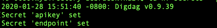 td wf secrets --project my_project --set apikey=1234565/abcdefghijklmnopqrstu --endpoint=https://api-workflow.treasuredata.comThe terminal displays the following results: