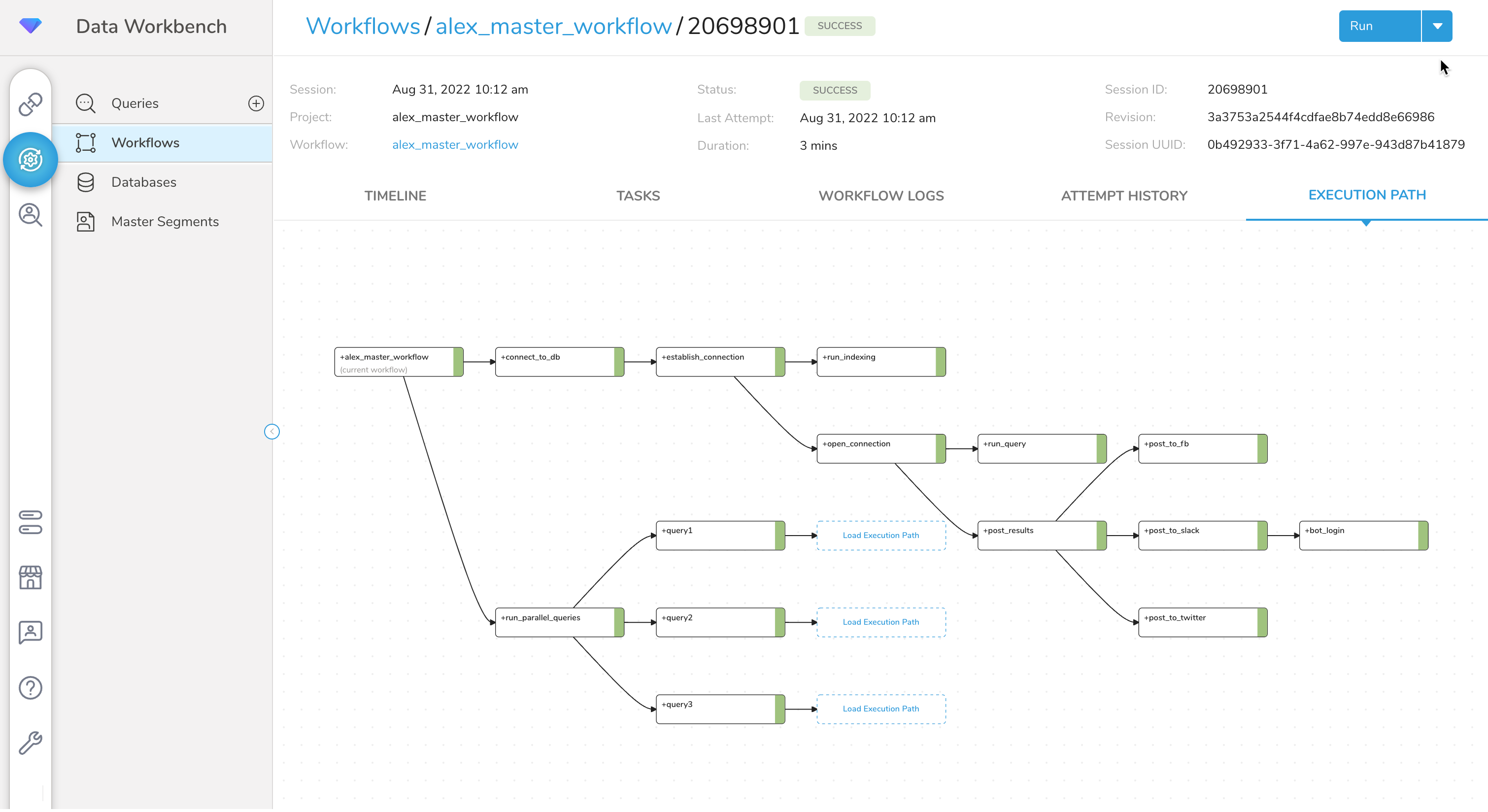 - Details of executed tasks and their dependencies in the order in which they were attempted in the workflow