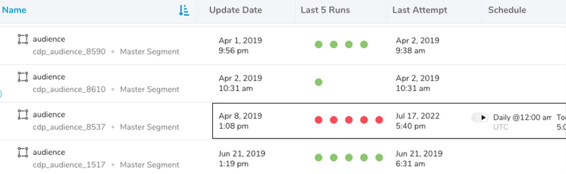 | Update Date | Identify the first date that the workflow was run. | This segment was first run on April 8, 2019, at 1:08 pm. |