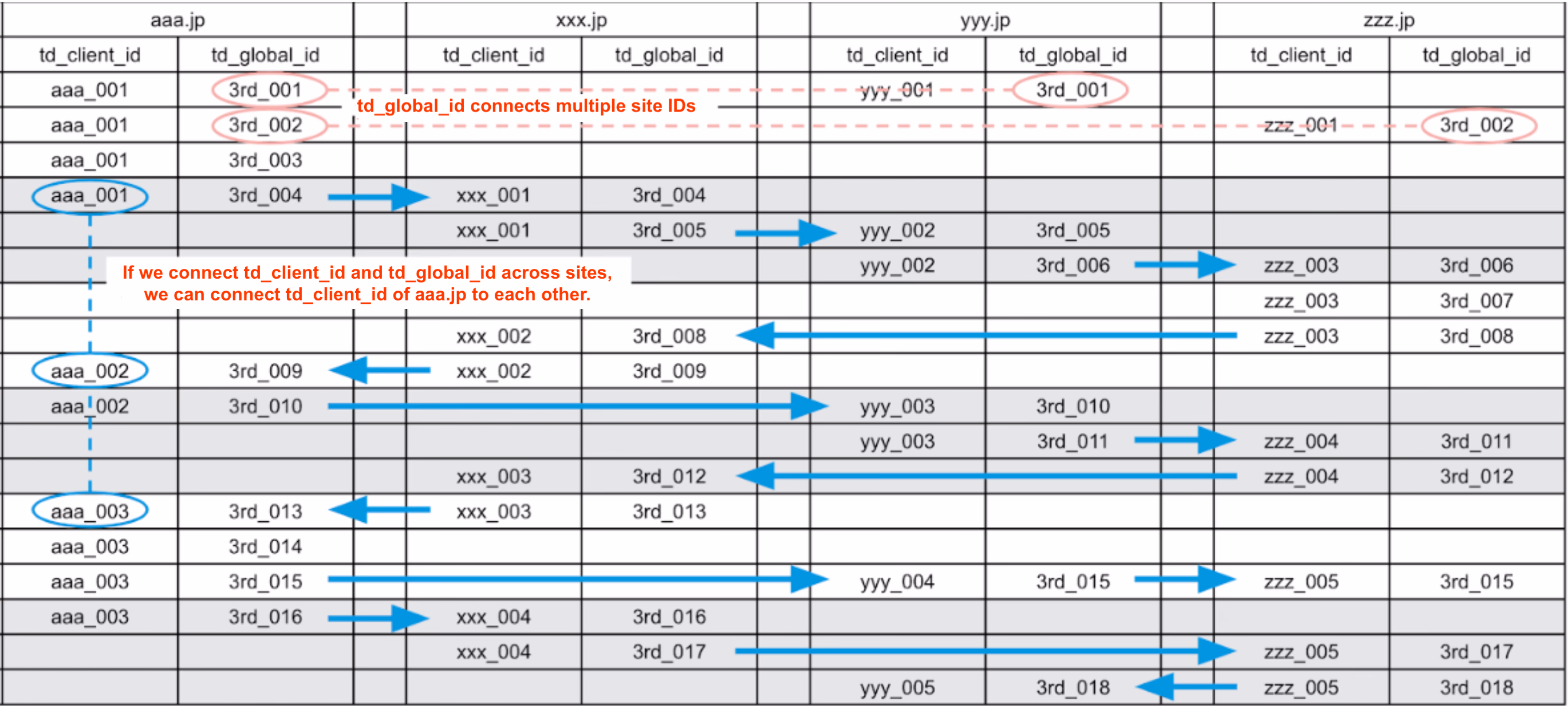 In this page, we will explain about cases where the same person is identified by stitching together the td_client_id and td_global_id of multiple sites. Consider the following data example where there are four sites and td_client_id and td_global_id are available in all tables.
