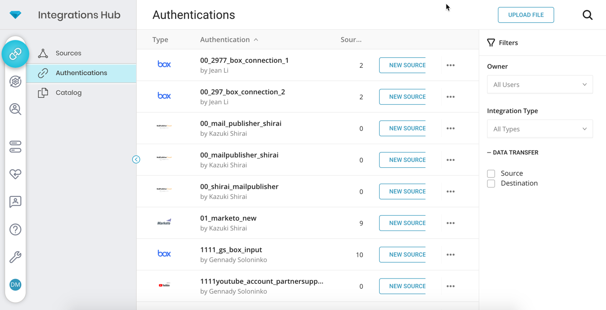 In Authentications, view or edit existing data connectors, upload CSV/TSV files, and create new transfers using previously established authentications.