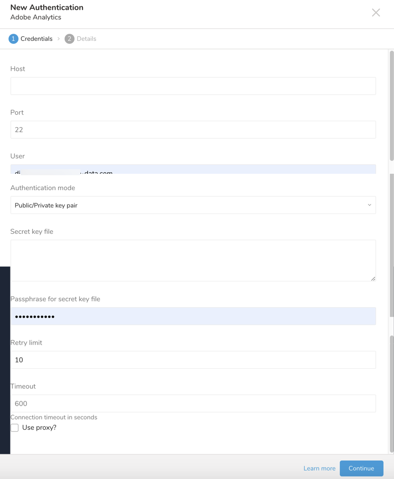 Create opens a dialog and you must edit the required credentials. Each integration has its own method of authentication. For further explanation of how to authenticate for that specific integration connection, you can select Learn More in the dialog box.