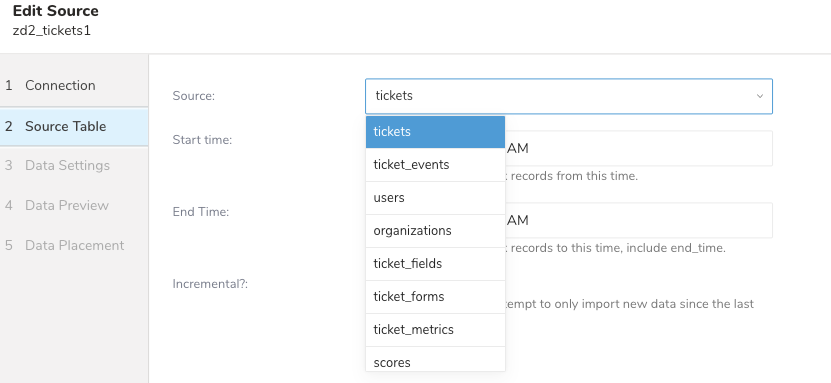 For example, a Zendesk source includes the common fields Source and Incremental.