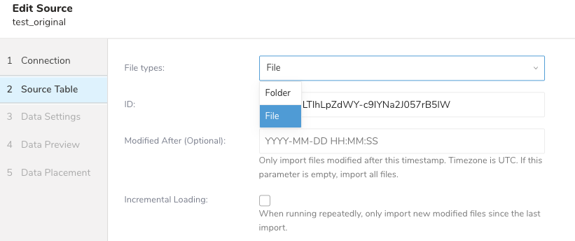 For example, a Google source includes a file type and incremental loading field.