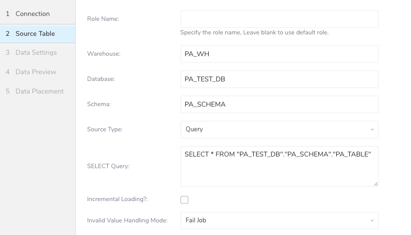For example, a Snowflake source includes Database and Schema name fields.