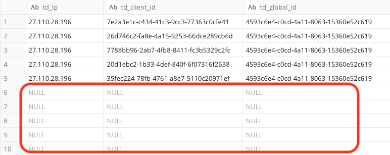 select td_ip,td_client_id,td_global_id from <db name>.<tbl name> In the following table, you can see the columns td_ip, td_client_id and td_global_id were excluded from the streaming data sent to TD.