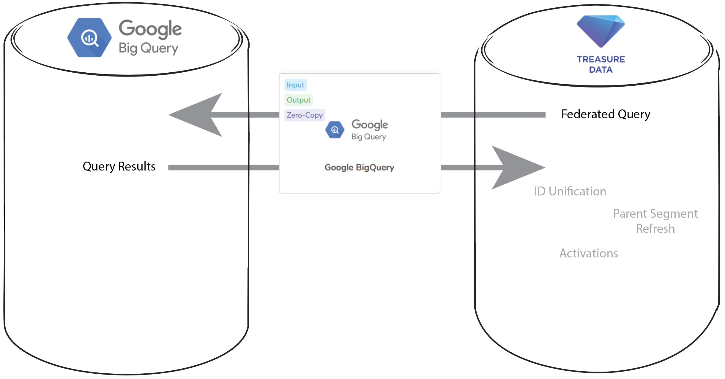 Performing zero-copy from the BigQuery Datawarehouse leverages the Treasure Data BigQuery integration to perform a federated query. The data flow looks like this: