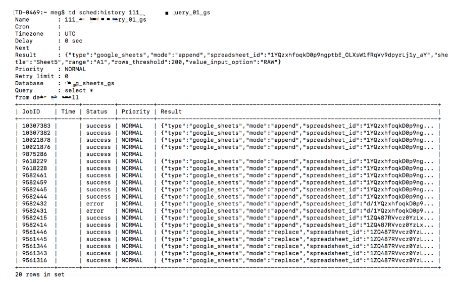 td sched:history shows the job history of a schedule entry. To investigate the results of each individual job, use td job <jobid>.