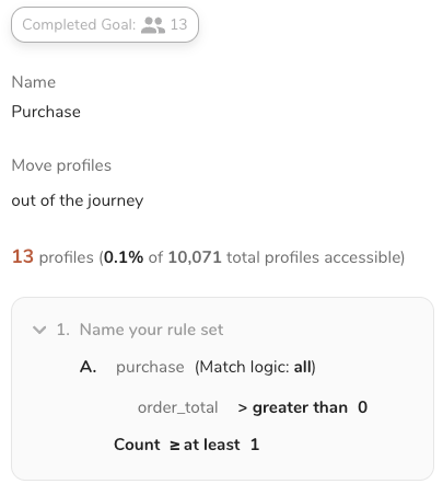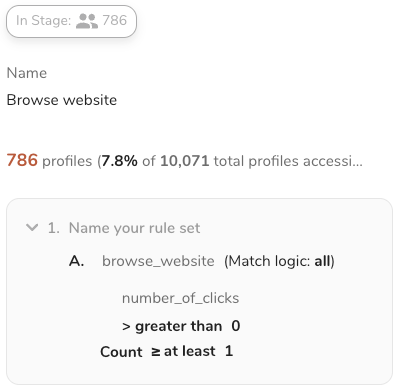 The sum of the profile count is 786, the same number as the profiles that entered the Awareness stage. This indicates that the profiles successfully transitioned through the journey stage.