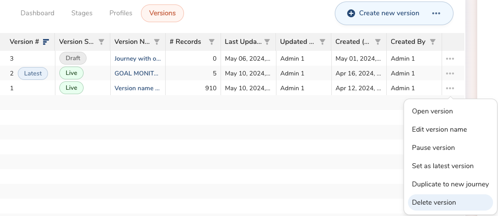 - Profile re-entry : When you delete a batch journey version, profiles in the deleted version are removed from the batch journey. Profiles can re-enter the latest version of the journey, however, which step the profiles were in from the deleted journey will not be remembered if they re-enter the latest batch journey version.