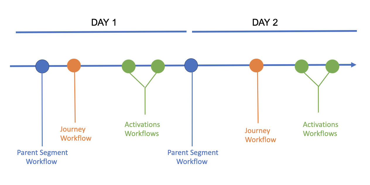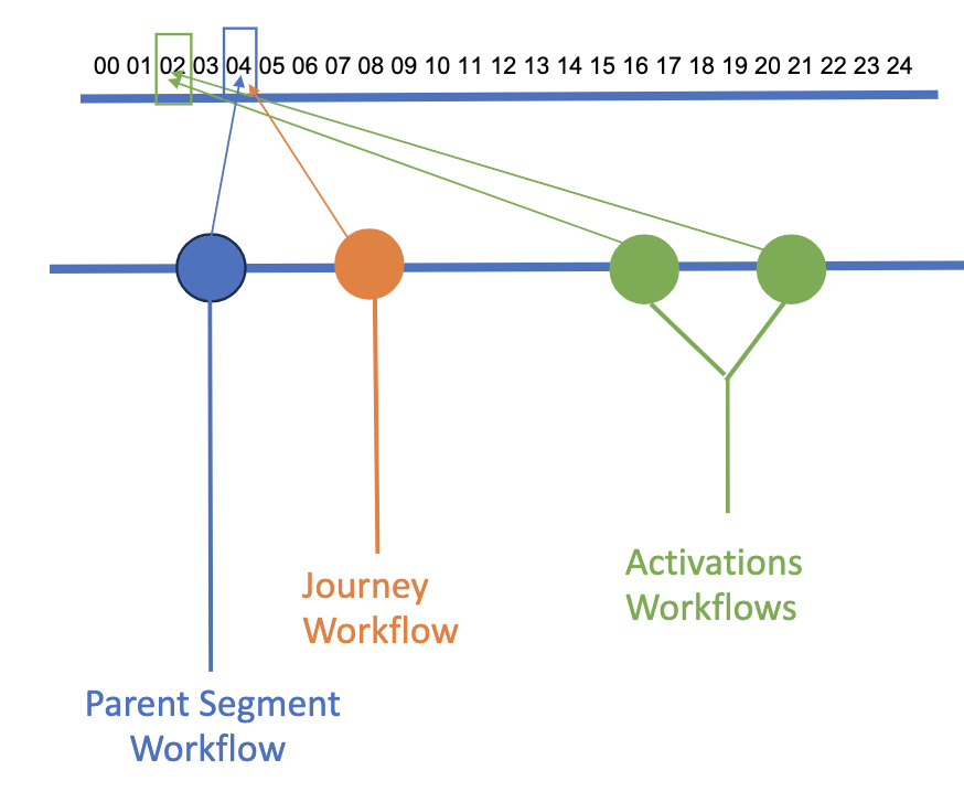 Let's assume you schedule your activations to start at 2:00 each day. However, the parent segment and journey workflows are scheduled to run at 4:00 daily. This means your activations will not have access to the more recent profiles that the parent segment refresh can provide.