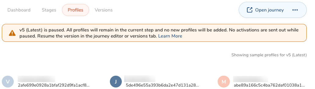 The Profiles panel provides a sample of profiles in the latest version of the journey. From here, you can select a profile to view the specific attributes and behaviors of that profile.