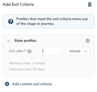 - Stale profiles : Profiles that meet exit criteria move out of the stage or journey. You can also add custom exit criteria with stale profile conditions.