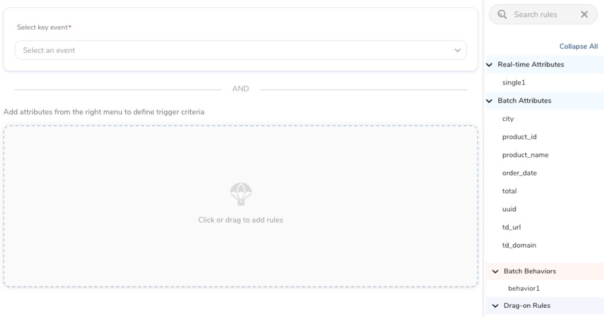 - Custom: Add rules, including key events with filters, real-time attributes, batch attributes and behaviors, and drag-on rules.