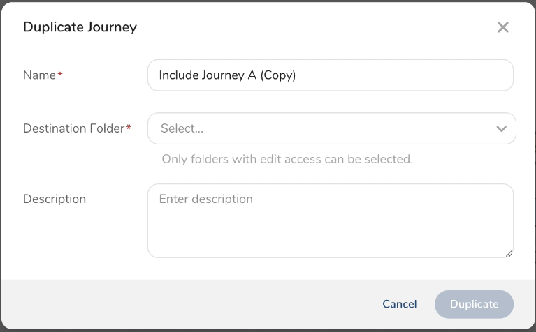 - From the drop-down menu, select the folder where you want the duplicated journey to be located. You will need to have edit access to the destination folder.