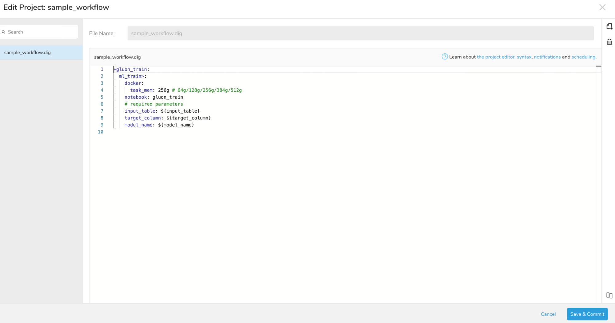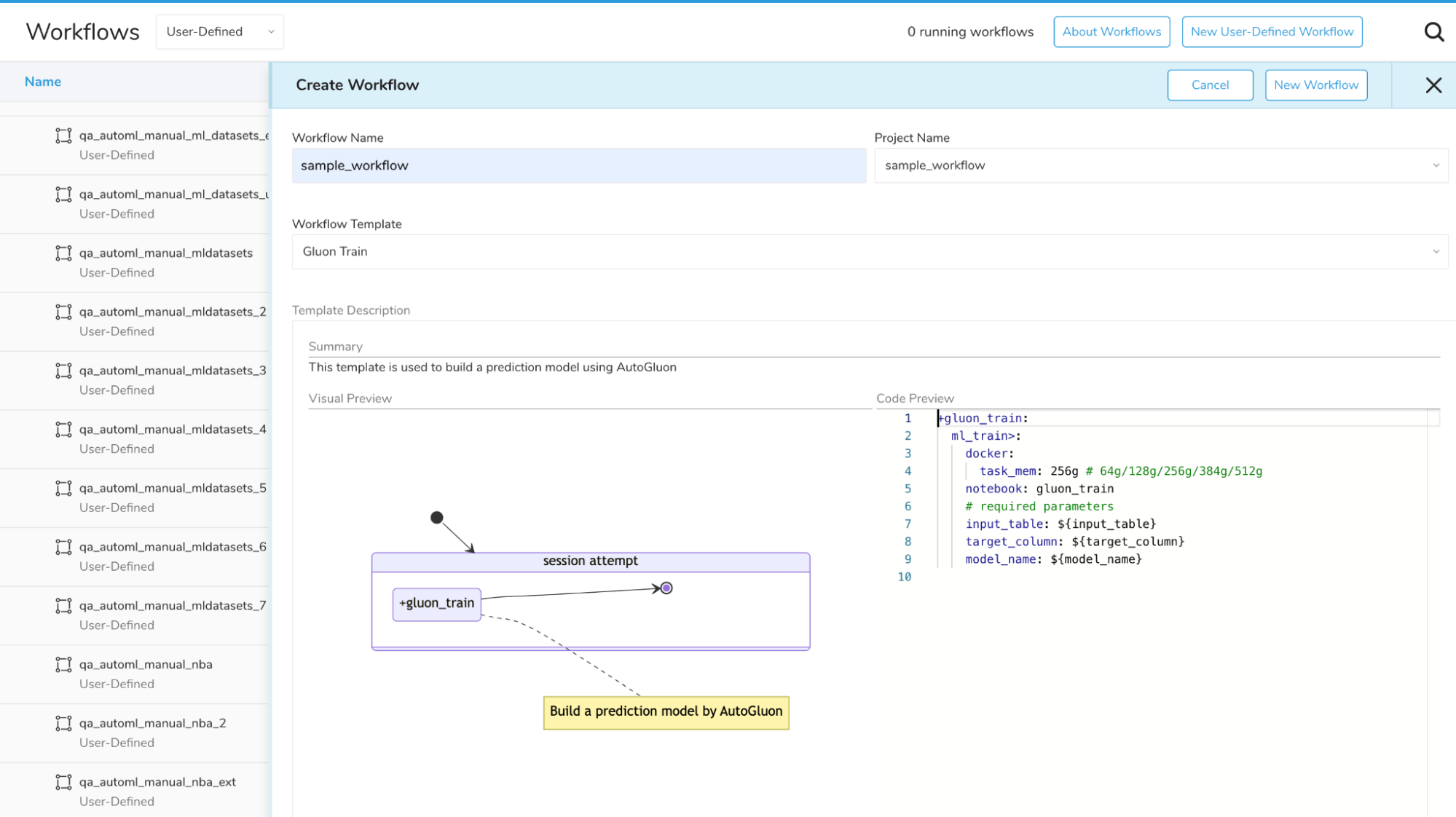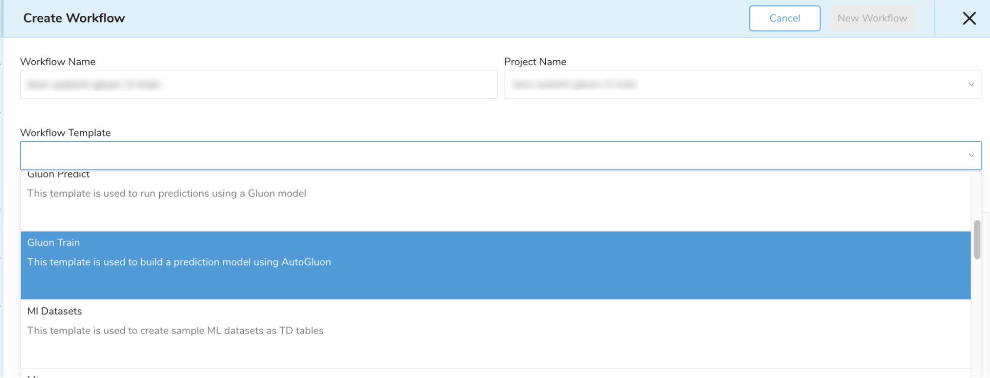 - Select a ML notebook solution in the Workflow Template. For example, Gluon Train, Gluon Predict, or a custom solution operator.
