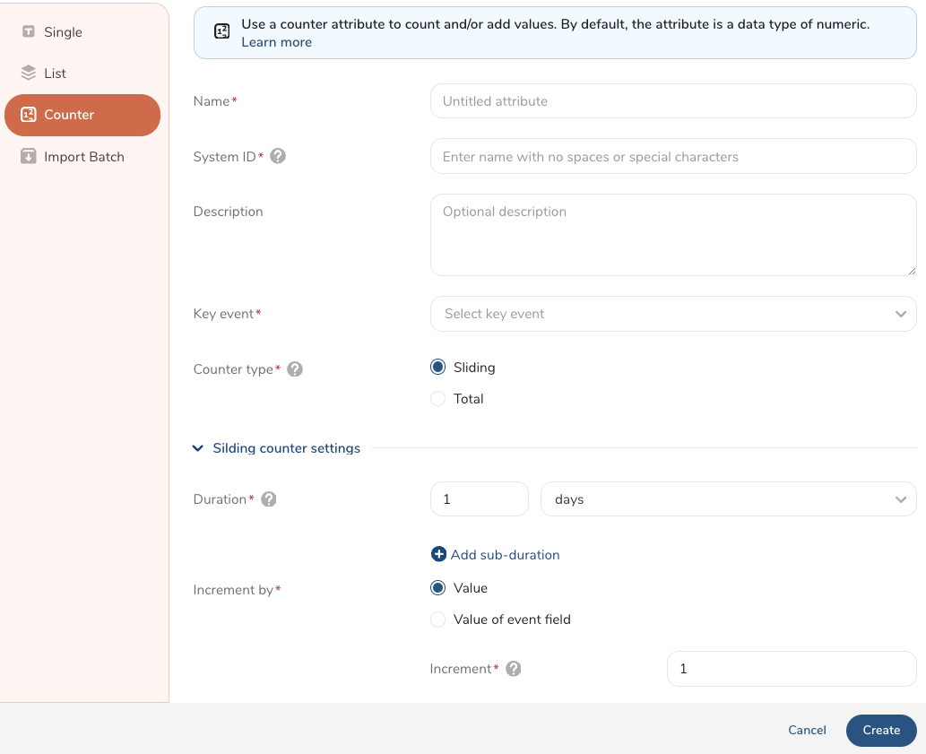 - A sub-duration must be specified for a sliding counter attribute to be accessed in a real-time journey and activation.