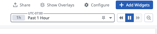 To filter by time, on the top right of the Datadog Dashboard UI, there is a dropdown to select the timeframe to view. Either a preset can be chosen, or you can select a date range from a calendar. Next to the dropdown, there are also UI buttons to rewind, pause, and forward the current time selected.