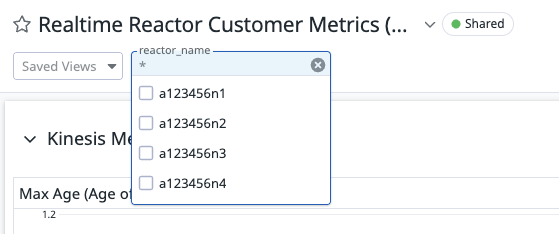 To filter by reactor name, on the top left of the Datadog Dashboard UI, there is a dropdown to select the particular reactor the dashboard displays. By default, all reactors are shown. Selecting reactors within the dropdown will update the dashboard to show only information from the selected reactors.