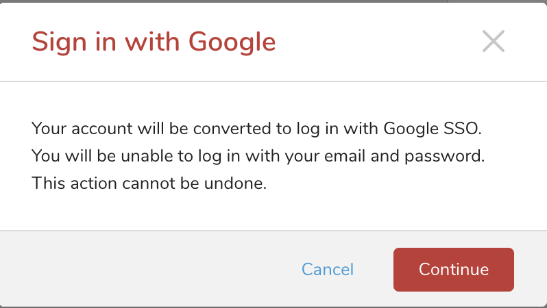 When you convert your user sign-in to Google SSO, neither you nor your TD administrator can change your user account from Google SSO back to Email and Password login mode. You must contact Treasure Data Support to revert back to your Email and Password.
