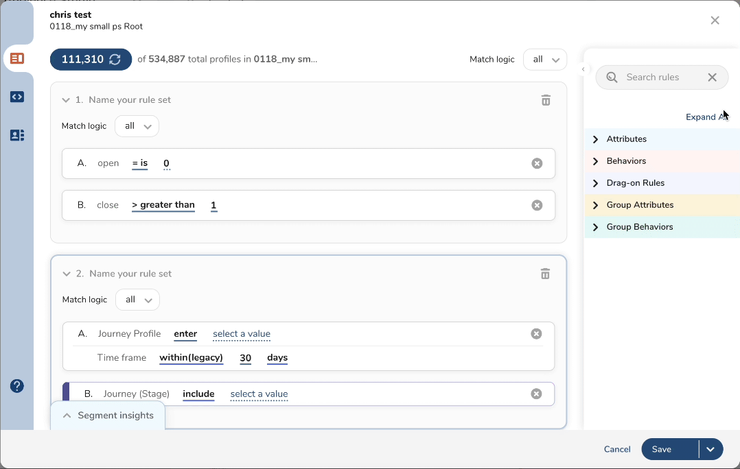 Audience Studio Segment Rules editor enables you to create segment rules to help you find individuals who meet a specific criteria. With this improvement, you can easily expand or collapse all attributes or section headers with a single click using a Expand All / Collapse All button.