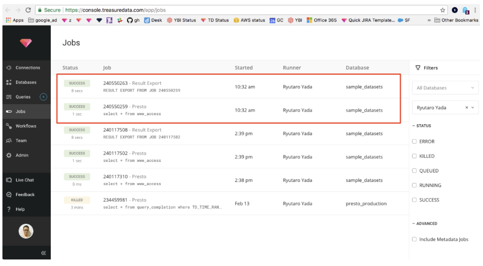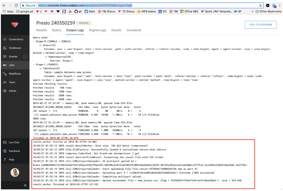In the Presto/Hive Query Job, the end of the log will now indicate the new Result Export job being created:
