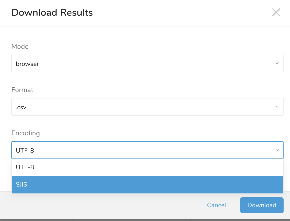 SJIS encoding enables you to open CSV files that contain Japanese characters. You can download your query results from TD Console as an SJIS-encoded CSV file and then open the CSV in Microsoft Excel.