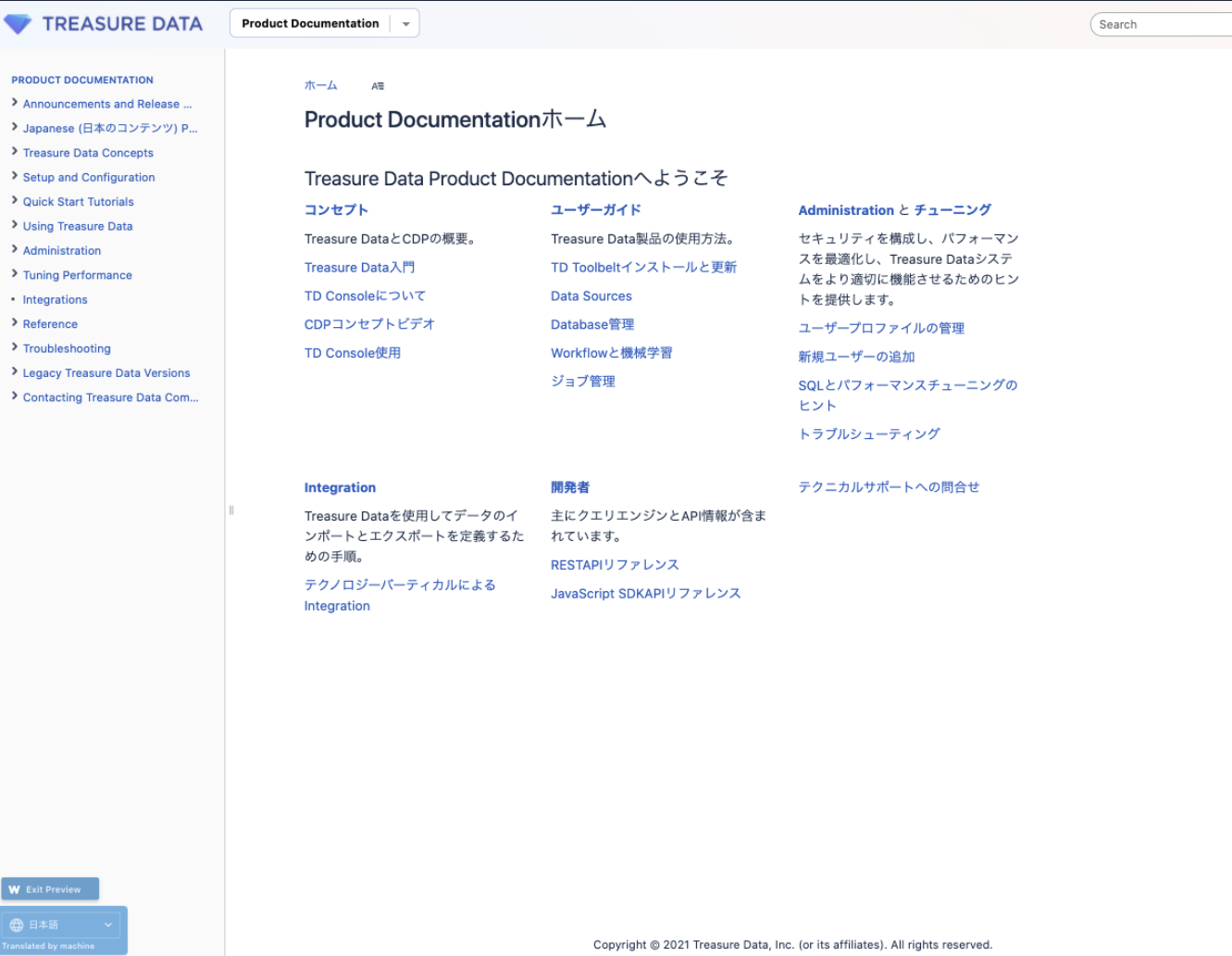 Treasure Data has released a Japanese Localization feature using machine translation on docs.treasuredata.com. The new feature is meant to improve the international user experience. Now, docs.treasuredata.com includes a new regional picker to select English and Japanese. After you select the Japanese language, you will be taken back to the page you came from with the content localized in Japanese.
