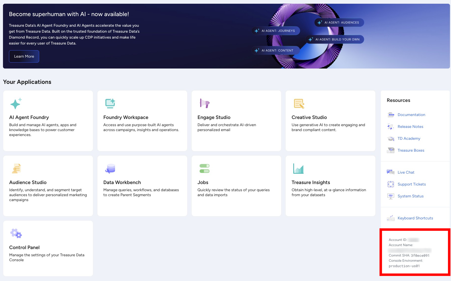 Your account ID and account name identify a Treasure Data environment. You might have several environments, for example, production, staging, and development.