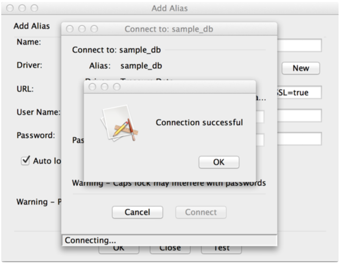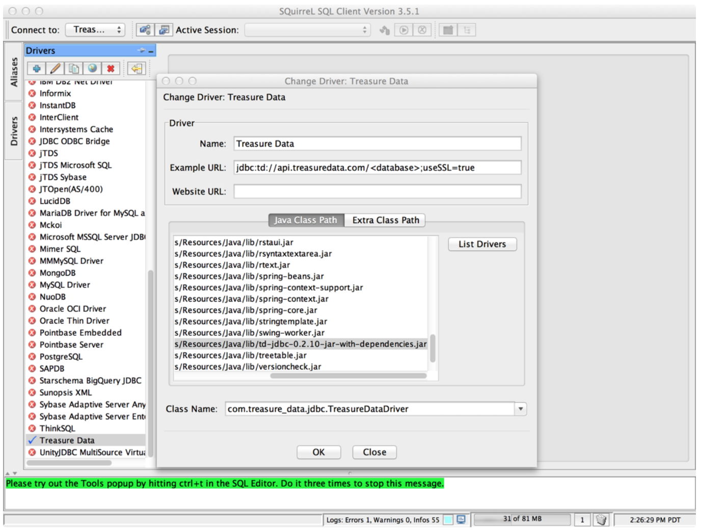 $ mv td-jdbc-0.2.10-jar-with-dependencies.jar /Applications/SQuirreLSQL.app/Contents/Resources/Java/lib/The target directory is $SQUIRREL_SQL_INSTALL_PATH/lib/ on Windows and Linux.
