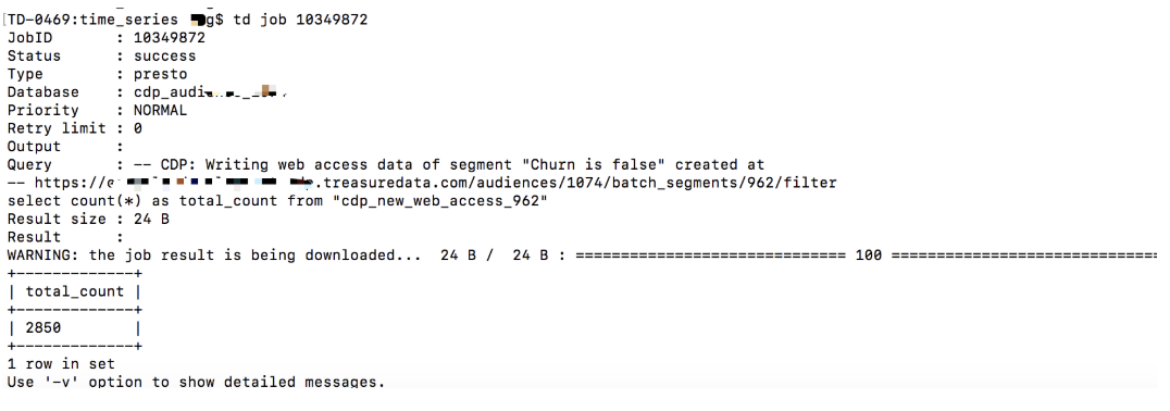 $ td query -w -d testdb "SELECT COUNT(1) FROM www_access"Job 702 is started.